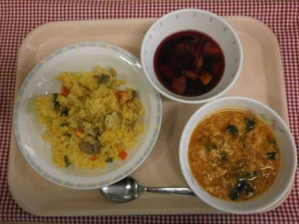スペインは、ヨーロッパのイベリア半島にある国で、代表的な料理である「パエリア」は日本でも有名です。日本ではシーフードが有名なパエリアですが、本場では鶏肉やいんげん豆、きのこを使ったシンプルなものも多いです。ご飯の色は黄色く、サフランを使用します。サフランは、クロッカスの仲間の花のめしべの部分で、赤いひも状をしています。一つの花に一本しか取れないので、とても高価なものです。そのため、今日の給食では、ウコンの花からできているターメリックを使用しました。同じ黄色の色ですが、味が違います。機会があれば、ぜひお家でサフランを試してみてください。