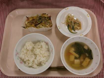 今日の主菜は、ロールキャベツ風のおかずです。ひき肉とたまねぎ、コーンを入れ、米粉とおからで固さを調整したたねの上にキャベツとチーズをのせて焼きました。米粉は、お米を製粉したもので、団子やパン、麺にも使われており、もちもちとした食感が特徴です。おからは、豆腐を作る過程で豆乳を絞った残りのものです。たんぱく質や食物繊維が豊富に含まれていて栄養満点な食品です。ぜひお家でも食べてみてください。
