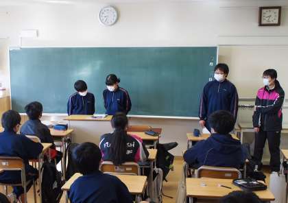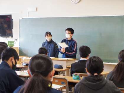 いつもであれば、朝読書でしーんとしている時間ですが、今日は昨日開かれた委員会報告をしています。