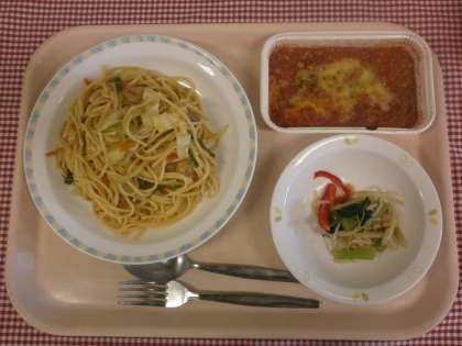 今日は、麺が主食の献立です。今日の麺は、「和風スパゲティ」です。