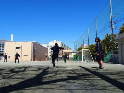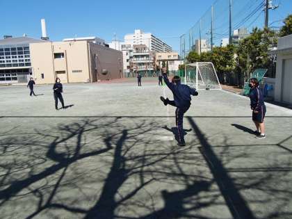 お日さまがあたると、校庭もだいぶあたたかくなってきました。青空に向かってキックするのはとても気持ちがいいものです。9期生にとって、卒業まであと少し。昨年から本当にいろいろあったけど、こうやってみんなで楽しく授業ができることが何よりです!