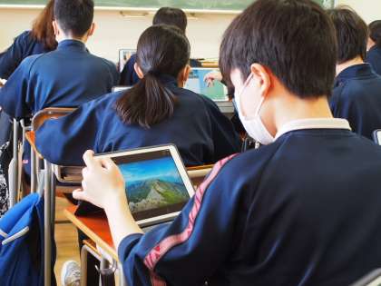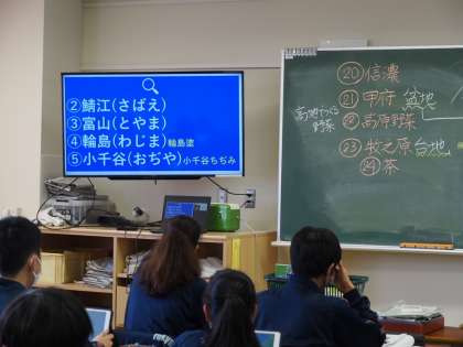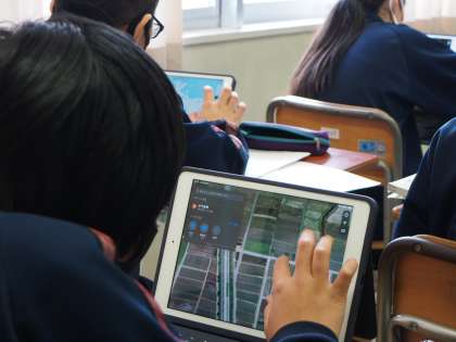 今10期生の地理[中部地方]ではひとり一台のタブレットPCの地図ソフトを使っ都市や地形を調べています。今まで社会の地理と言えば、教室の前に大きな地図を掛けて説明したり「地図帳の〇ページを開いて、探してごらん」という学習でした。このタブレットPCを使うと、一気に地理学習の世界が広がります。