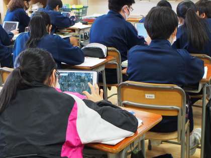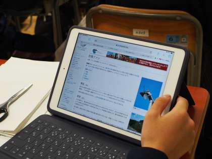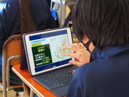 とりかく自分の指を使うだけで、日本全国どこへでも行ける魅力に探求心がどんどん広がります。三枚目の画像の生徒は、台地で栽培する茶畑にある不思議な「扇風機」の様なものを、その場ですぐインターネットで調べ「なるほど〜」とうなずいていました。