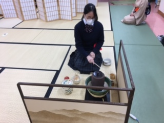 今日から三回に分けて、三年生の卒業記念お茶会を開催します。コロナ禍ですが、密をさけて学年別に行います。今日は一年生をお招きしました。最終日は三年生の先生方と管理職の先生をお招きします。後輩への置き土産として、そして先生方への感謝を込めて、お点前を披露します。(大橋)