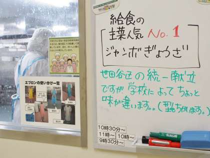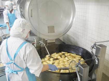今日の給食は主菜部門で堂々人気No.1のジャンボ餃子です。美味しそうに揚がってきました。
