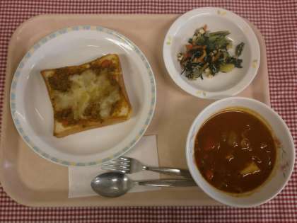 今日のパンは、「チーズカレートースト」です。ドライカレーとチーズを食パンの上にのせて焼きました。