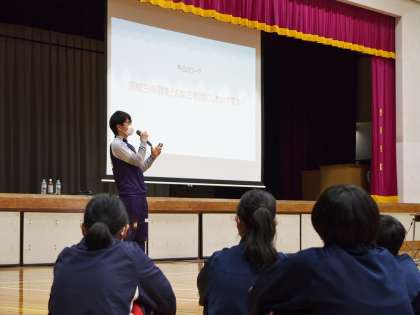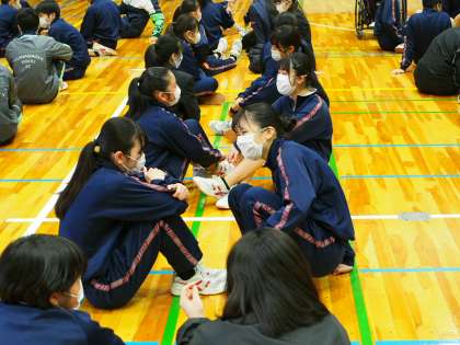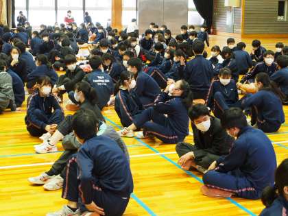 講演では、小林選手から「みなさんがこれから進学する高校3年間を、どのような3年間にしたいですか」という課題が出されたあと、隣近所の生徒とお互いの考えを語ります。こういった場面でも、まったく躊躇することなく、すぐに隣近所と語りだすところが、フナキボ9期生のすごさです。