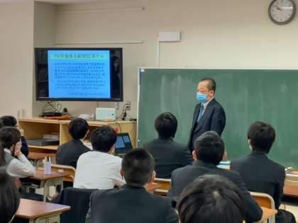 卒業前の3年生に向けて、校長先生の授業です。教員になったきっかけや戦争と平和の話など興味深いお話で、生徒たちは熱心に聞き入っていました。(片山)