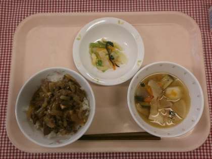 平成23年の東日本大震災の影響で放射線物質が検出された牛肉が出回ったことから、給食では牛肉の使用を自粛していました。しかし、その後の様々な検査で安全性が確認されたことから、世田谷区でも2月から学校給食での牛肉の使用が解禁されました。本校では、和牛肉を使用した牛丼を出しました。残さず食べてください。