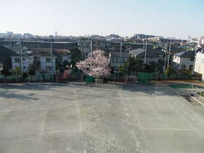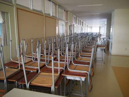 修了式の翌日の校内です。教室のワックス掛けのため、すべての椅子と机が廊下に出ています。