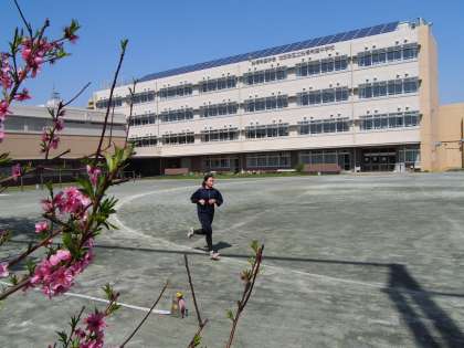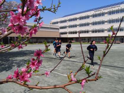 陸上競技部が春の陽気の中、校庭を走り抜けていきます。