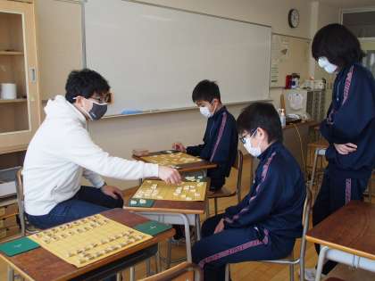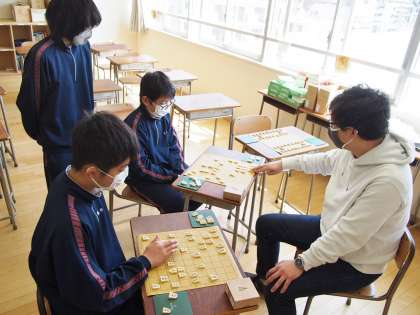春のうららかな陽射しがさしこむ土曜日の教室では、将棋部が活動しています。パシッと将棋盤を打つ音が教室に響きます。