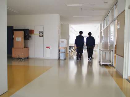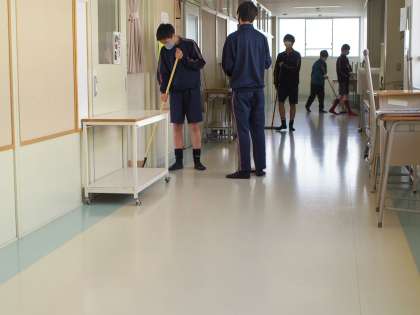 生徒の話し声がする方向に廊下を進むと、ホウキをもったサッカー部に出会いました。「えらいね。これはボランティアですか?」と聞くと「そうです!」との答えが。(一時でも『もしかしたら、ペナルティーでやらされている?』と疑った私を許してください…)