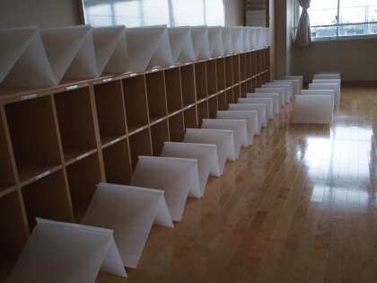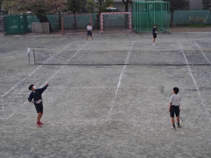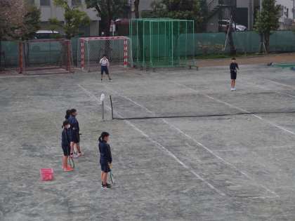午後にさっと一雨降った校庭ですが、あたりが薄暗くなってきてもソフトテニス部は元気にボールを追っています。撮影するために立ち入った1年生教室には、給食の時に使用するパーテーションの予備の分を消毒をして乾かしてありました。