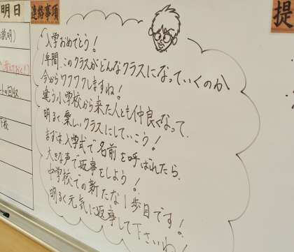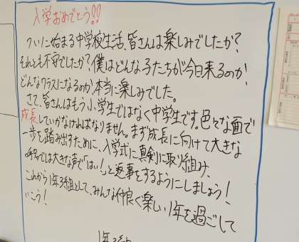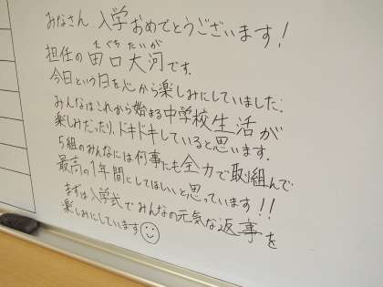 12期生の教室には担任の先生からのメッセージも、教室後ろに書かれていました。初フナキボ生として、このメッセージをしっかり受け取ることができたかな?