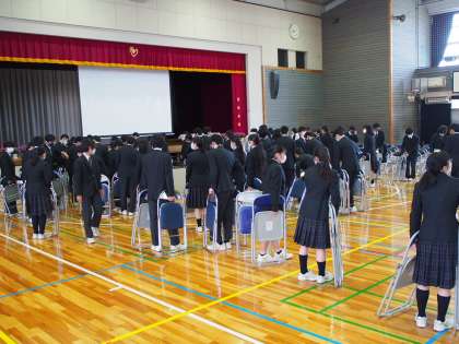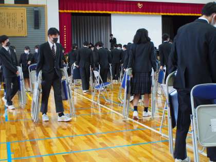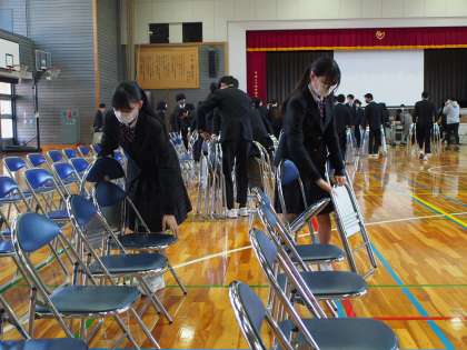 12期生が教室にもどった後、1組の担任が自分のクラスの生徒に椅子の片づけを頼んだところ、あれよあれよと言う間に他のクラスの生徒が加わり、あっと言う間に片づけが終わりました。すごい意識の高さ。見事な成長ぶりの10期生です!