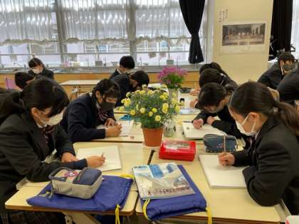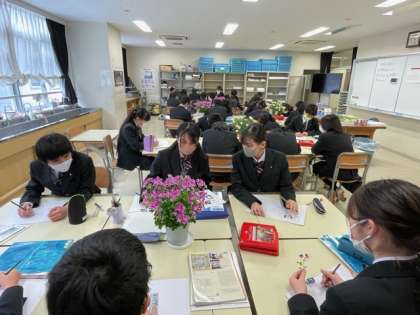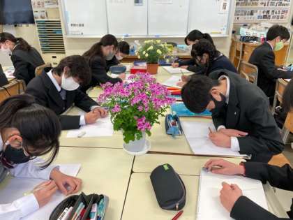 みんな真剣に描いています。手元を見ている人が多いので、対象物をよく見ることを意識するともっと良いですね!これからもいろんなものを見てスケッチを続けていくので、成長が楽しみです。(美術科 岩崎)