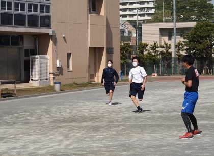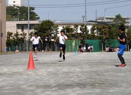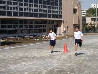10期生の体育です。早くも運動会へ向け、練習開始です。赤いコーンをまでは全力で、そして走り抜ける練習です。