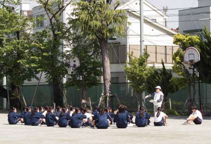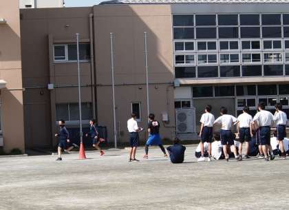 体育の時間でも、フナキボ精神は随所に発揮されます。待機している友達は、ゴールに迫る2人に声援を送り、走り抜けると「いえ〜ぃ!」と歓声をおくります。そして、みんながゴールした後、集合して最後のまとめをする先生を見つめる眼差し。これぞ、フナキボスピリッツです。