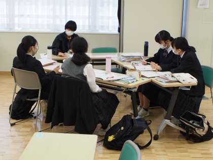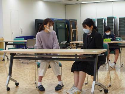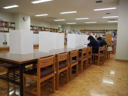 感染症対策の関係で、地域の施設や塾など自習できる場所がなくて困っている、という声を聞いた学校地域支援本部の進路プロジェクトが「まなBASE8(ベース)」を立ち上げ、フナキボ卒業生や地域の大学生からポランティアを募って始めました。アクティブルームでは、勉強のことや進路のことなどフナキボの先輩に直接相談している姿があちこちで見られました。一方、図書室には文字通り‘silent’で集中するフナキボ生のいつもの姿です。