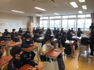 試験直前の2-5の様子です。担当の先生が試験を受ける上での注意事項を話してくれます。 (石塚)