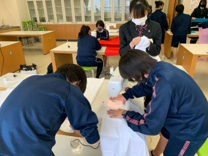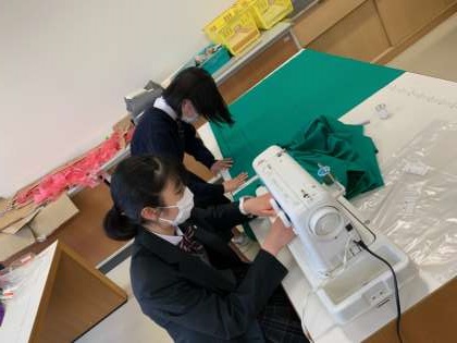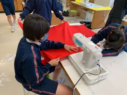 三年生女子のクラス旗係と、女子の体育委員が放課後に残って旗を縫ってくれています。
