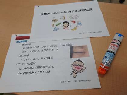 実際にエピペンのトレーニング用の模型を使い、さす位置の確認、実際の動作等も練習しました。