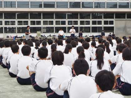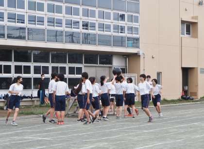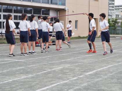 大縄に代わる10期生の学年種目を体育委員がみんなの前で実演しています。本番までに改良を重ね、より安全でより楽しく、そして笑顔でできるものにしていくようです。お手本を見せる時も、それを見ている態度もやっぱりフナキボ10期生です。