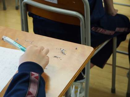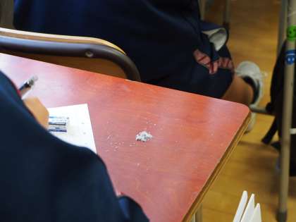 真剣に原稿を書いている机を回っていると、あることに気づきました。消しゴムのカスをきちんと貯めている人がいます。そうです、美化委員がポスターで呼びかけているのを思い出しました。えらいな〜、ちゃんと掃除する人のことを考えているのですね。