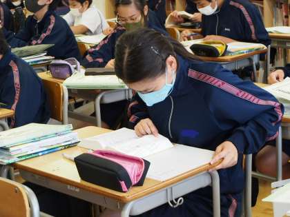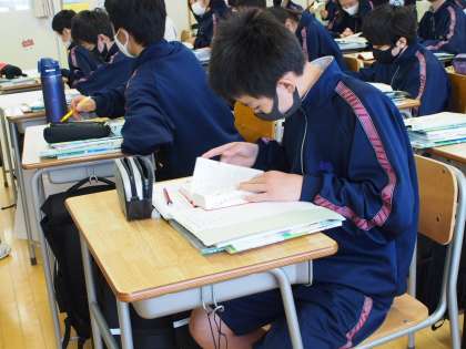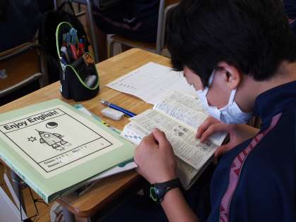中学校の英語の最初の学習では、辞書を引くことも大切な要素です。この真剣な姿がフナキボ生です。