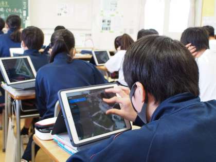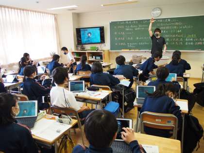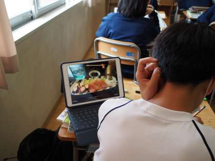 先生が50インチモニターに映した画像と同じ場所を探しています。もちろん、手で拡大縮小ができるのも強み。おっ、なんと島の民宿で出される夕食のメニューを探し当てた生徒もいました。