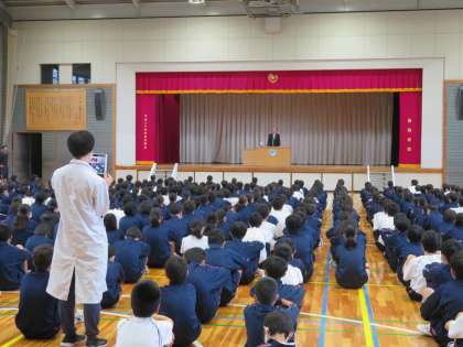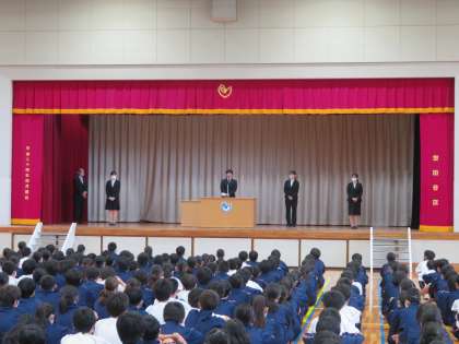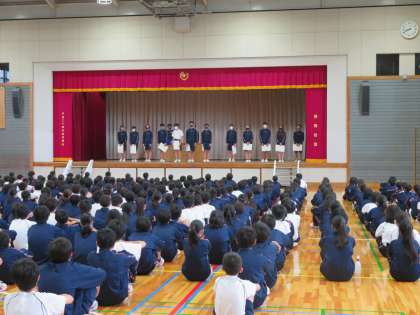 本日、体育館で全校朝礼が行われました。密を避けるために、1・2年生は体育館、3年生はZoomでの配信となります。