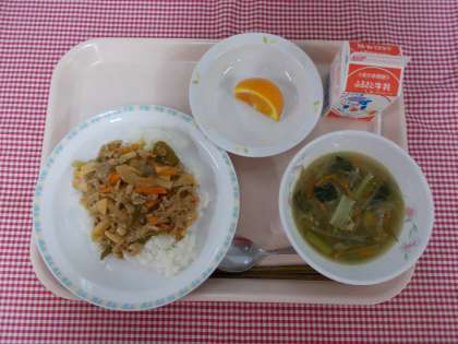 この日の給食の主食は、「スタミナ丼」でした。豚肉とたっぷりの野菜が入った具をごはんにかけていただきます。豚肉には、疲労回復効果があるビタミンB1が豊富に含まれています。ピリ辛な味付けなので、ごはんに合いますよ。
