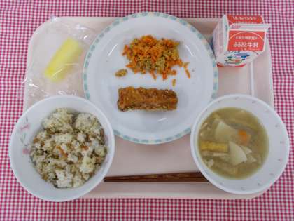 1972年5月15日は、アメリカ合衆国から沖縄が復帰した日です。それにちなんで、今日の給食では沖縄県の郷土料理を出しました。沖縄県の郷土料理は、豚肉や昆布を多く使用し、暑い気候でも元気に過ごせる工夫がなされています。今日の給食の「ししじゅうしい」と「イナムドゥチ」も豚肉をつかった料理です。「しし」は豚肉、「じゅうしい」は炊き込みご飯、「イナ」はいのしし、「ムドゥチ」はもどきという意味があります。「イナムドゥチ」は、豚肉が入ったお味噌汁のことです。