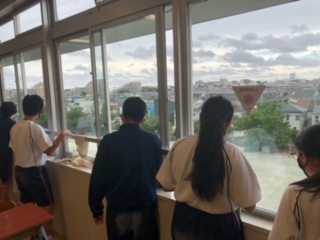 2年生の休み時間では校庭で行われている他学年の運動会練習の様子を眺めています。みんな同じ色のクラスを応援していました。