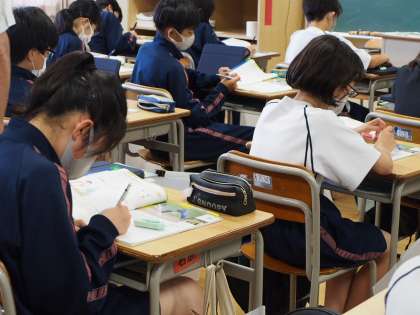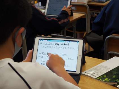 12期生の英語ではデジタルとアナログの組み合わせを試みています。マスクで口元が見えないため、デジタル教科書の口元映像の発音はとてもよくわかります。授業の最後にはやはりノートに手で書いたものを残します。