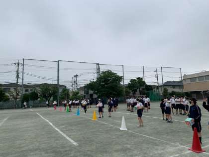 サイコロの出た目の数だけコーンを回るので、1を出す練習をしたり、必勝法を見つけるぞ!と意気込んでいるクラスが沢山見られました