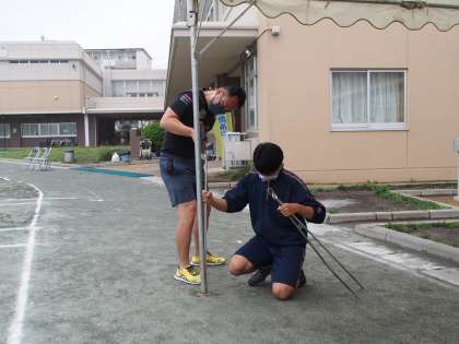 朝から校庭整備と準備で係生徒が活躍中です。