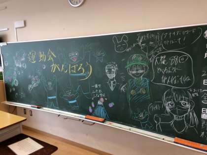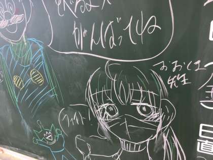 クラスの生徒が黒板に応援メッセージを書きあげました。実習生の絵も描いてあります。すっかりクラスの一員になりました。