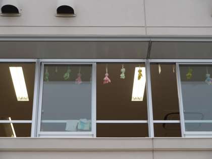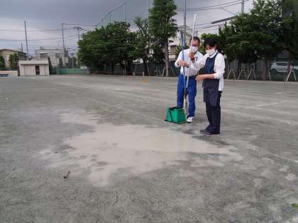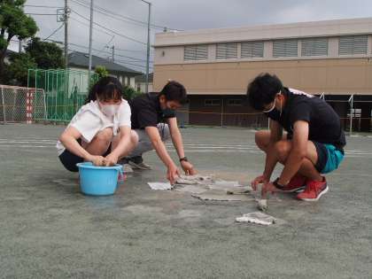 生徒が6時間目の授業をしている頃、学校主事さんや体育の先生が、ぞうきんやモップで校庭の水分を取り、ラインが引きやすいように準備をしています。教室の窓際には‘おまもり’が掲げられています。御利益があることを切に願いつつ勉強に励むフナキボ生です。