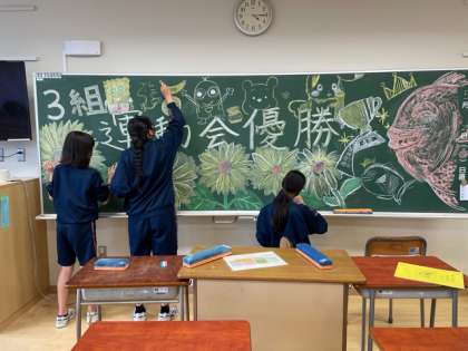 昨日の朝は運動会延期が決まり、さすがに疲労感が隠せない生徒たち。でも6時間の授業を終えて、気持ちを切り替えて火曜日の運動会本番を迎える準備をしました。教室では各クラスで黒板アート(2回目)がなされ、校庭ではグランド整備がされていました。生徒も先生も、頑張っています。今日と明日はゆっくり休み、体調を万全にして本番に臨みましょう!(岩崎)