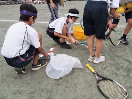 こちらも選手が触れた道具を消毒しています。数に限りがあるので、短時間で消毒を完了します。
