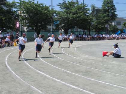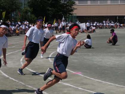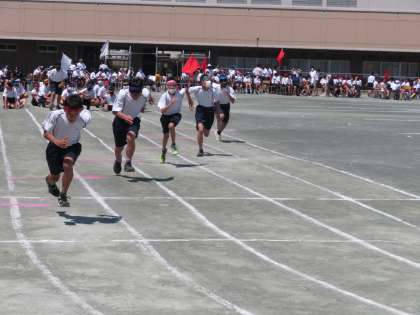 2年生の100M走の様子です。1年生のときに比べ、男女ともに迫力ある走りが出来ています。(田村)