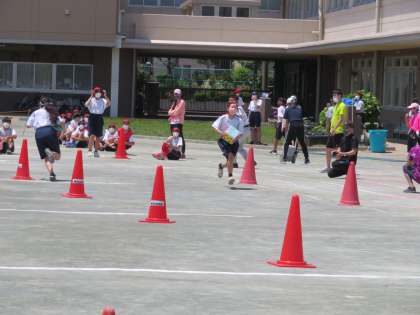 今年度からの新種目、コロコロさいころリレーの様子です。サイコロを振って、出た目の数のコーンのところまでの往復を3人でリレーする競技です。