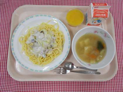 主食は、「キャベツのクリームスパゲッティ」です。ホワイトソースにチーズや生クリームを合わせて濃厚な味わいにしました。スパゲッティによく絡めて食べてください。