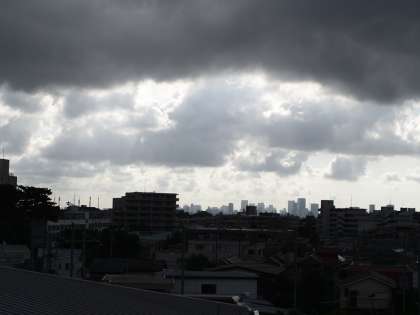 雲の合間から都心の高層ビルに光が当たっています。ひまわりのイラストは昨日よりもバージョンアップ?
