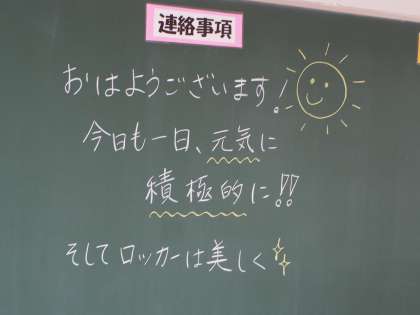 11期生のあるクラスには担任からのメッセージが。おそらく、機会をみて同じこと手をかえ品をかえ伝えているのだろうときお察しいたします。なるほど、遠くからみるとなんとか納まってはいるけれど、今にも落ちてきそうなロッカーもちらほら。はみ出さず、きちんと種類ごとに揃っていると、落ちることもないのでしょう。