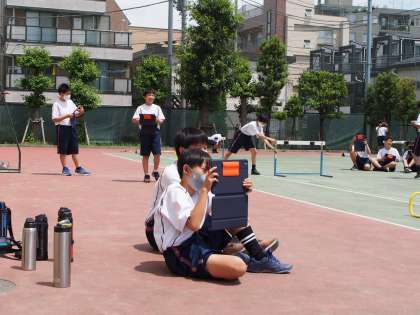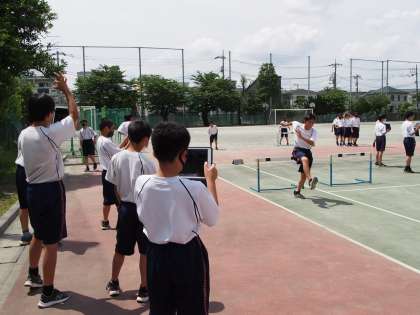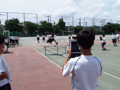 12期生の体育ではハードルに挑戦しています。自分のフォームを確認するために使うツールがタブレットです。2人一組になって相互に撮影と練習を積みかさねていきます。