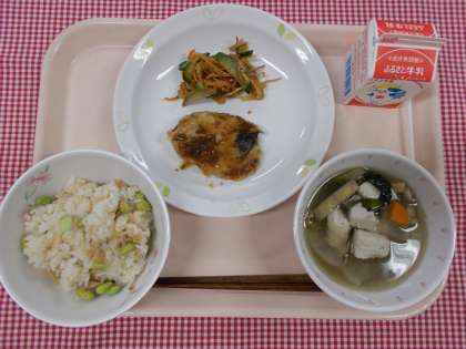 6月4日〜10日は、歯と口の健康週間です。よく噛んで食べる習慣を身に付けてほしいので、給食では「かみかみメニュー」を出します。今日は、「あじの香味揚げ」と「かみかみサラダ」です。かみごたえがあるので、よく噛んで食べてください。一口30回を目指して食べましょう。