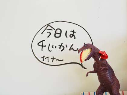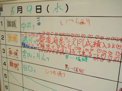 今朝もまぶしい陽射しが降り注ぐフナキボの校庭と校舎です。今日は世田谷区内の先生の研修会があるので午前中授業ということで、あるクラスのマスコットキャラクターが「いいな〜」とつぶやいています。でも、午前中の授業は集中してくださいね。